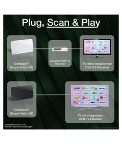 Με βάση τον νικητή της δοκιμής μας, το Oehlbach Scope Vision, παρουσιάζουμε τώρα τον διάδοχό του: Το Oehlbach Scope Vision 5G είναι μια συμπαγής εσωτερική κεραία που προσφέρει εξαιρετική λήψη DVB-T2 HD. Η κομψή κεραία DVB-T2 HD λειτουργεί με οποιονδήποτε εξωτερικό δέκτη DVB-T2 HD ή τηλεόραση με ενσωματωμένο δέκτη DVB-T2.Εξαιρετική λήψη σε αποδεδειγμένη ποιότητα Oehlbach Χάρη στο νέο φίλτρο 5G, η κεραία προστατεύεται από παρεμβολές από συχνότητες LTE & 5G, οι οποίες είναι πολύ κοντά στο εύρος συχνοτήτων του σήματος DVB-T2. Επιπλέον, ο νέος δέκτης του Scope Vision 5G είναι ισχυρότερος και εξασφαλίζει ακόμα χαμηλότερη λήψη θορύβου. Το Oehlbach Scope Vision 5G λαμβάνει την απαραίτητη ισχύ μέσω καλωδίου USB. Επομένως, μπορεί επίσης να τροφοδοτηθεί με ρεύμα απευθείας από την τηλεόραση. Όσοι προτιμούν να χρησιμοποιούν πρίζα μπορούν να το κάνουν μέσω του παρεχόμενου μετασχηματιστή ρεύματος.Ευέλικτη ρύθμιση Το Oehlbach Scope Vision 5G είναι πολύ συμπαγές και επίσης εξαιρετικά ευέλικτο ως προς την τοποθέτηση: Είτε είναι όρθιο, οριζόντιο είτε τοποθετημένο στον τοίχο με βίδες - μπορείτε να τοποθετήσετε ή να τοποθετήσετε την κεραία απευθείας στο σημείο που λαμβάνει το ισχυρότερο σήμα. Το εξαιρετικά μακρύ καλώδιο κεραίας (συνδέεται με τον δέκτη ή την τηλεόραση) προσφέρει επίσης μέγιστη ελευθερία με 1,8 μέτρα.